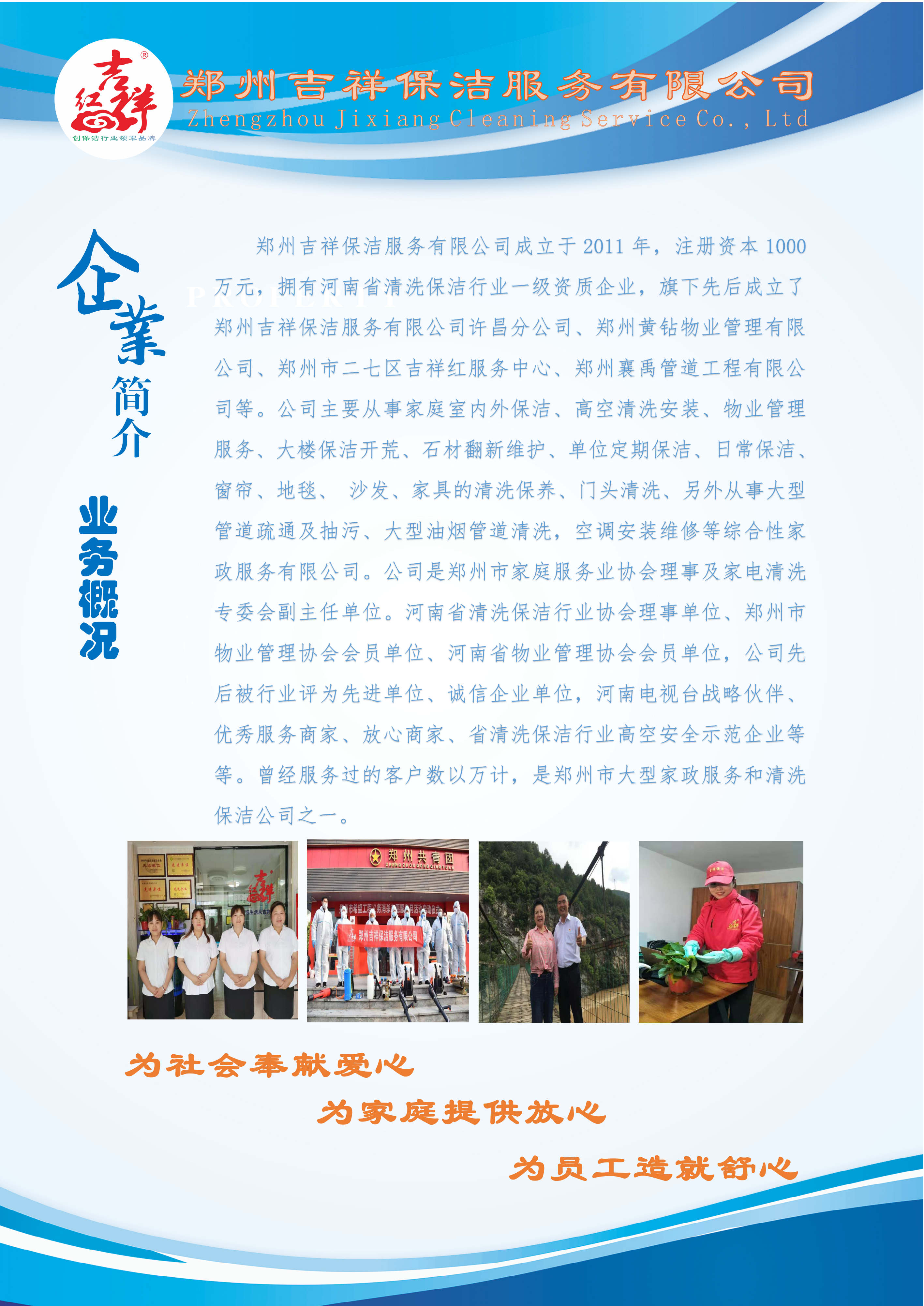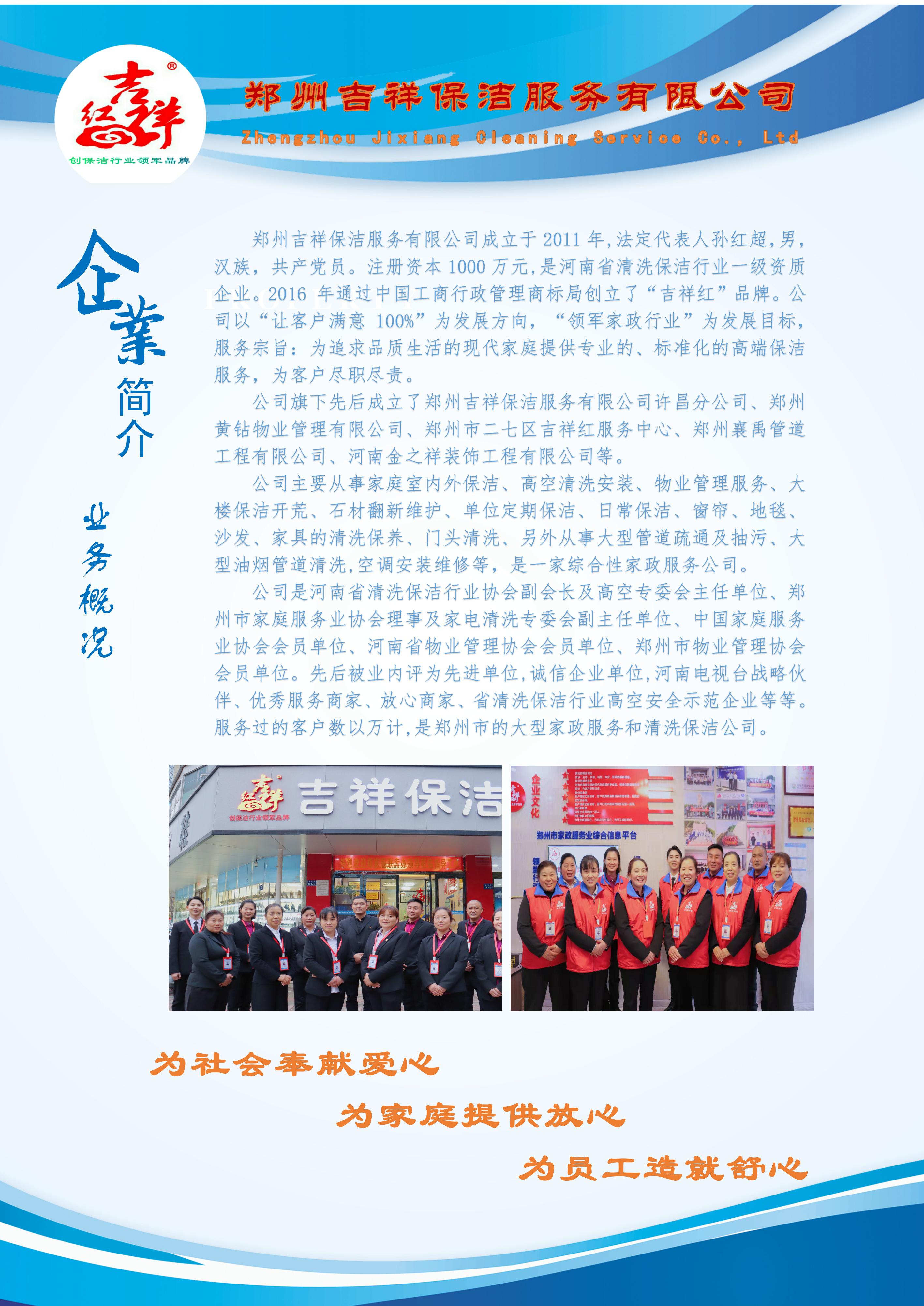 郑州吉祥保洁服务有限公司成立于2011年,法定代表人孙红超,男,汉族,中共预备党员。注册资本1000万元,是河南省清洗保洁行业一级资质企业。2016 年通过中国工商行政管理商标局创立了“吉祥红”品牌。公司以“让客户满意 100%”为发展方向,”领军家政行业”为发展目标。公司的服务理念:主动、亲切、诚信、专业、素养;服务宗旨:为追求品质生活的现代家庭提供专业的、标准化的高端保洁服务,为客户尽职尽责;公司的承诺:客户是我们的生命,客户的满意是我们存在的价值,让客户满意 100%。
